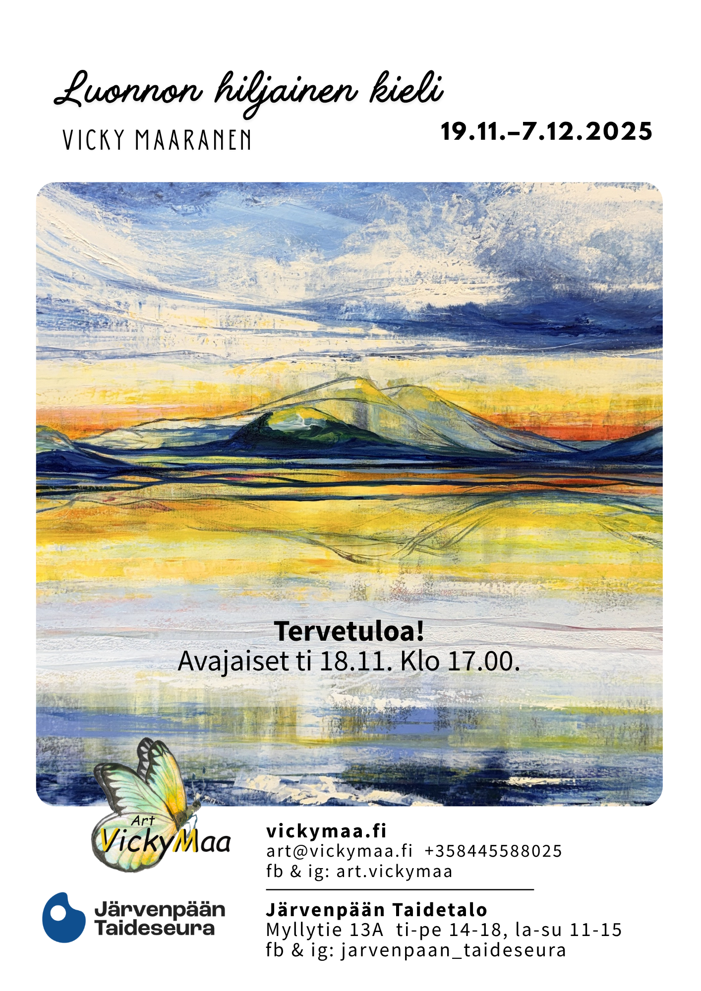 VickyMaa- Luonnon hiljainen kieli Järvenpään Taidetalossa 19.11.7.12.2025 Avajaiset TI 18.11. klo 17.00 Tervetuloa!
