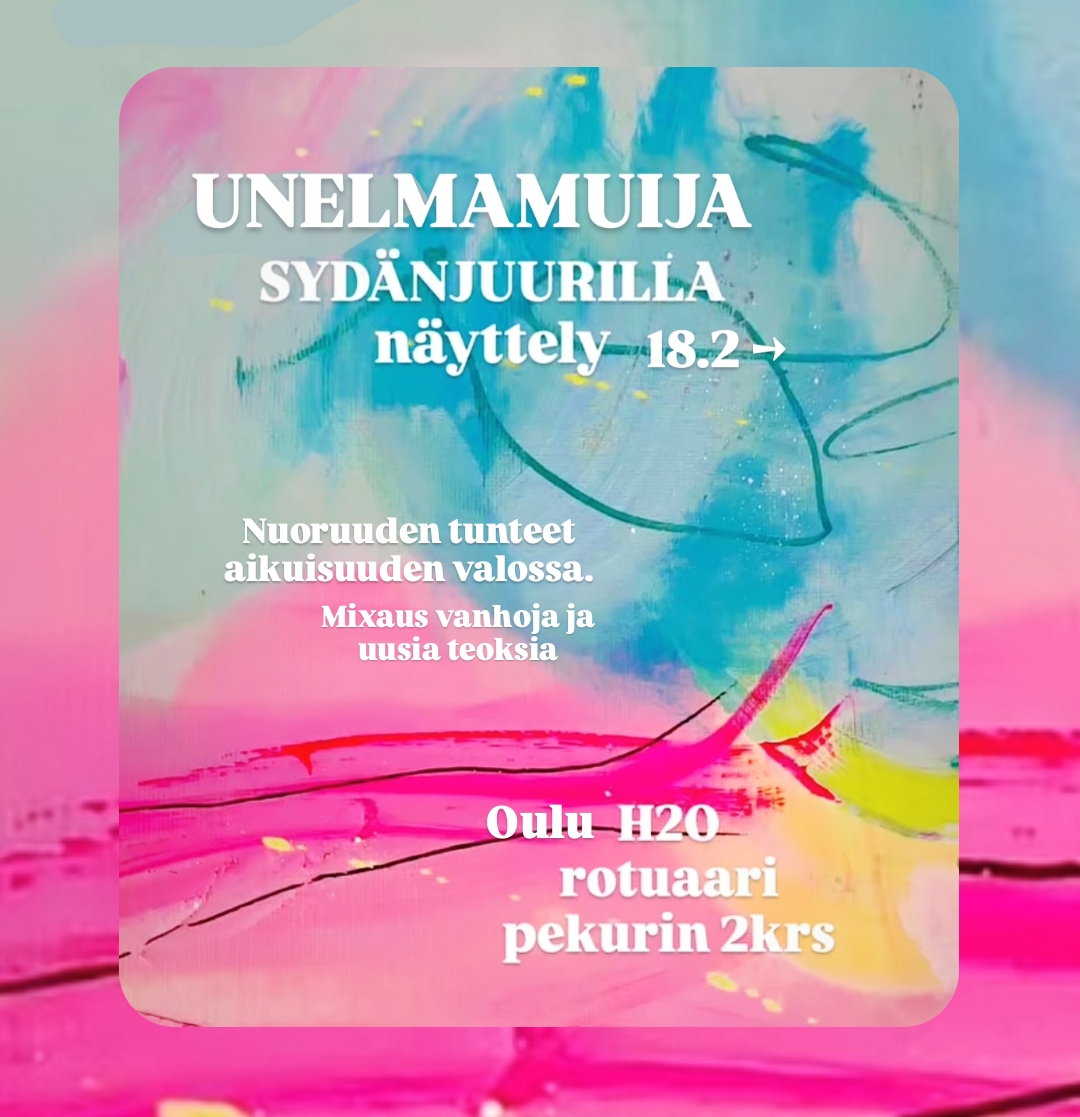 Unelmamuija näyttely @unelmamuija Sydänjuurilla –Nuoruuden tunteet aikuisuuden valossa Nuoruus koostuu voimakkaista tunteista – sun ensimmäinen rakkaus, kapina kaikkea kohtaan, ihanat pumpuliset haaveet ja suuret pelot. Aikuisuus tuo mukanaan uutta perspektiiviä, mutta tunteet eivät katoa mihinkään, ne vain muuttavat muotoaan. Sydänjuurilla on matka näiden suurten tunteiden läpi: sydäntä särkevästä kaipuusta, suuriin ilonhetkiin ja nauruihin, siitä ensimmäisestä rakkaudesta lopulta elämän mittaiseen ymmärrykseen. Näyttely tuo yhteen teini-iän raakuuden ja aikuisuuden kaihon, antaen tilaa sekä muistoille että uusille oivalluksille. Astu sisään ja tunne itse. Koe kokonaisvaltaisesti kuuntelemalla Spotifystä kunkin teoksen kohdalla sen oma biisi. Löydät ne Spotify -->profiili: UNELMAMUIJA -->SYDÄNJUURILLA ja jokaisen teoksen numero vastaa soittolistan biisinumeroa. OULU @health2organic rotuaari 18.2 alkaen