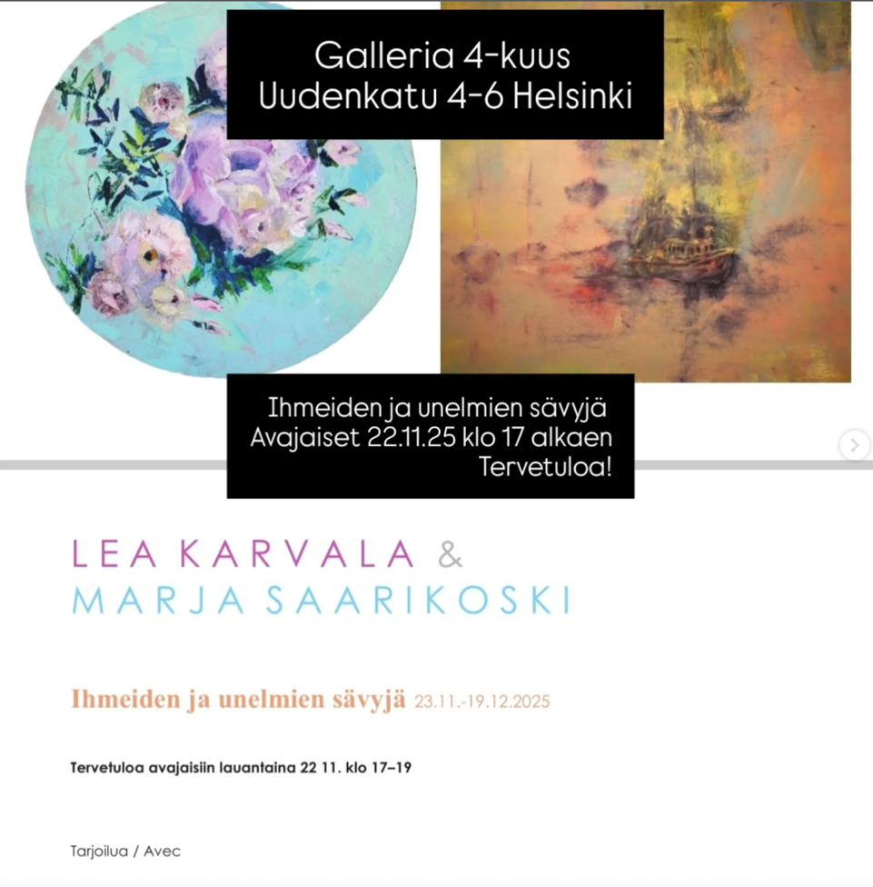 Marja Saarikoski ja Lea Karvala - ihmeiden ja unelmien sävyjä - Galleria 4-kuus, 23.11-19.12. Avajaiset 22.11 klo 17-19. Tervetuloa!