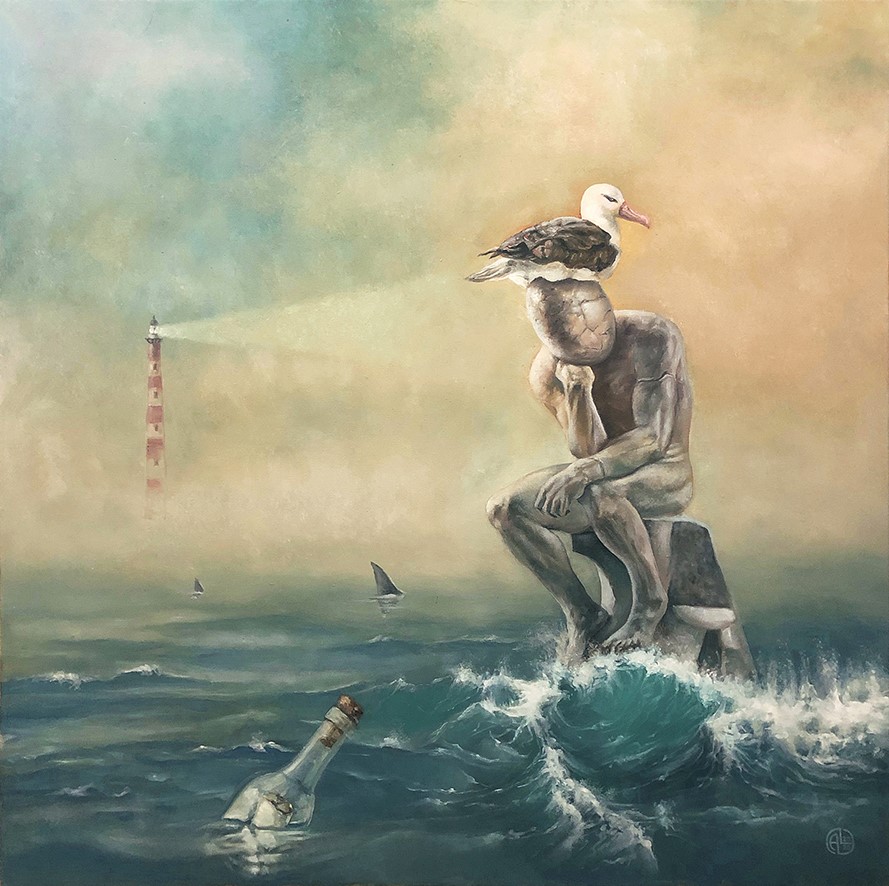 Message in the bottle 2019, öljy kankaalle 80 x 80 cm Kuvien navigointi Edellinen Seuraava Message in the bottle, Ari Lehtonen